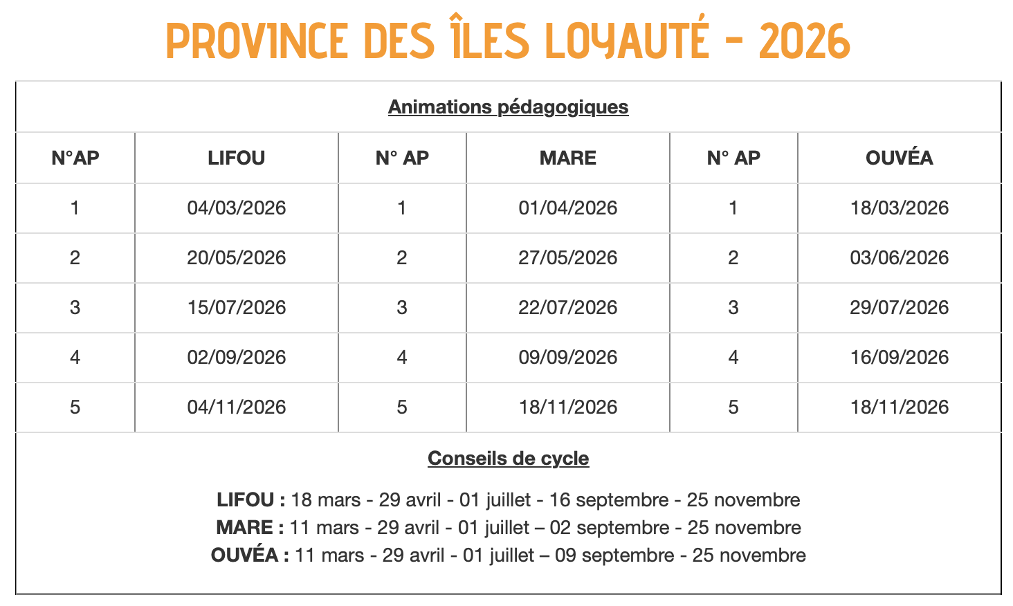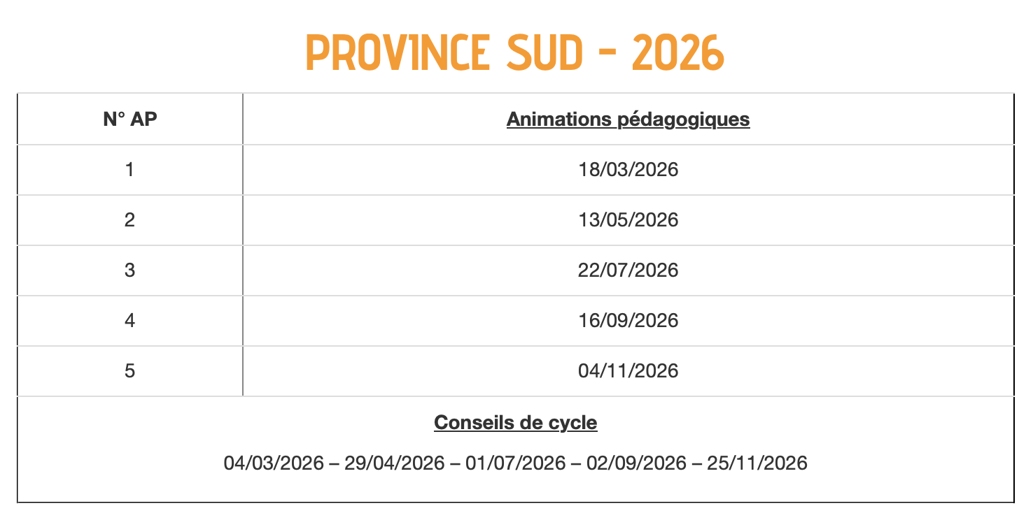 Les cinq autres demi-journées pédagogiques sont dédiées aux animations pédagogiques. Elles correspondent à des temps de formation professionnelle, directement liés aux priorités éducatives fixées par le gouvernement de la Nouvelle-Calédonie et aux besoins spécifiques des circonscriptions.
