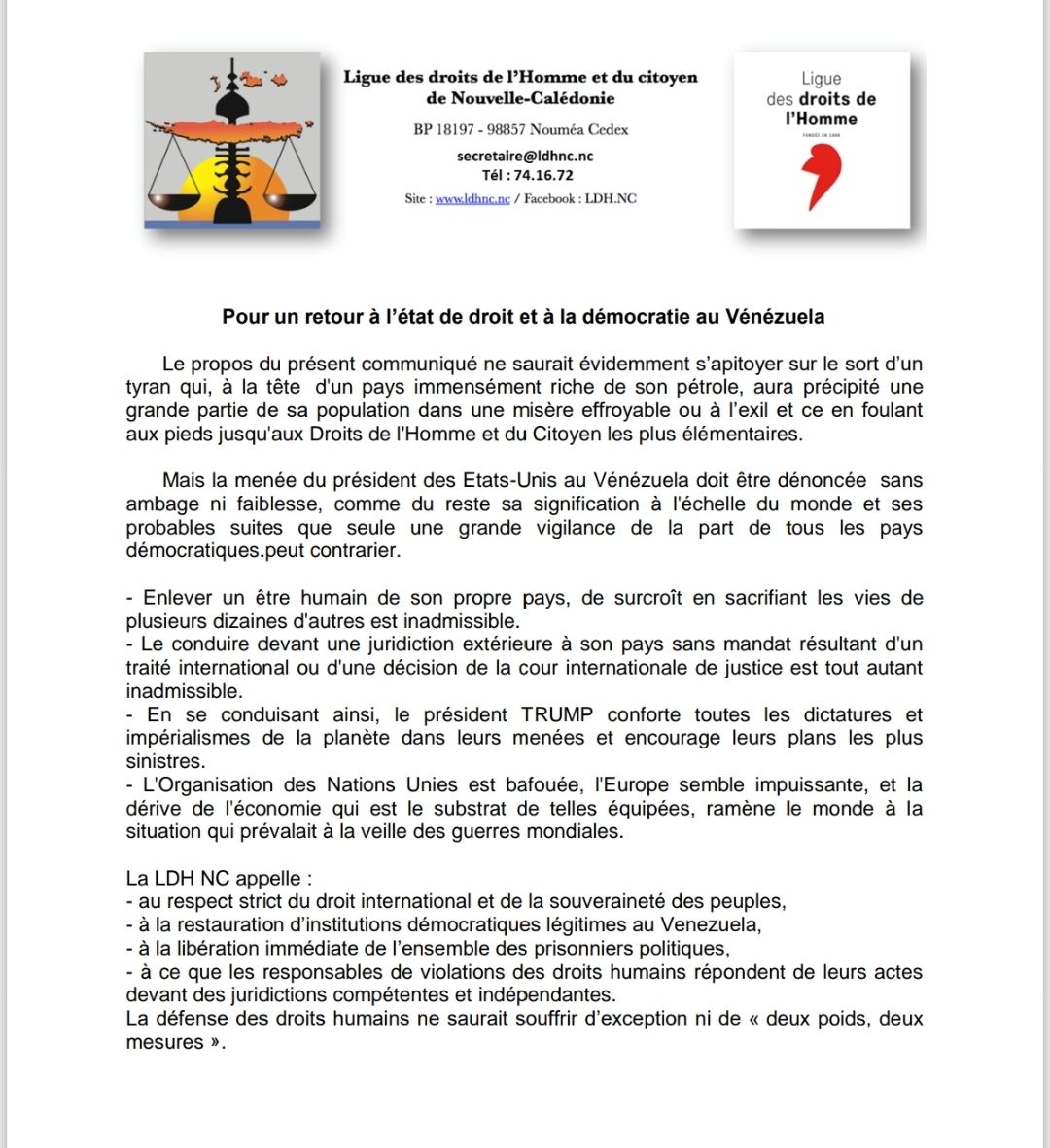 En s’exprimant sur le Venezuela, pays sans lien institutionnel, historique ou politique direct avec la Nouvelle-Calédonie, la LDH-NC donne le sentiment de fuir les débats qui dérangent ici.